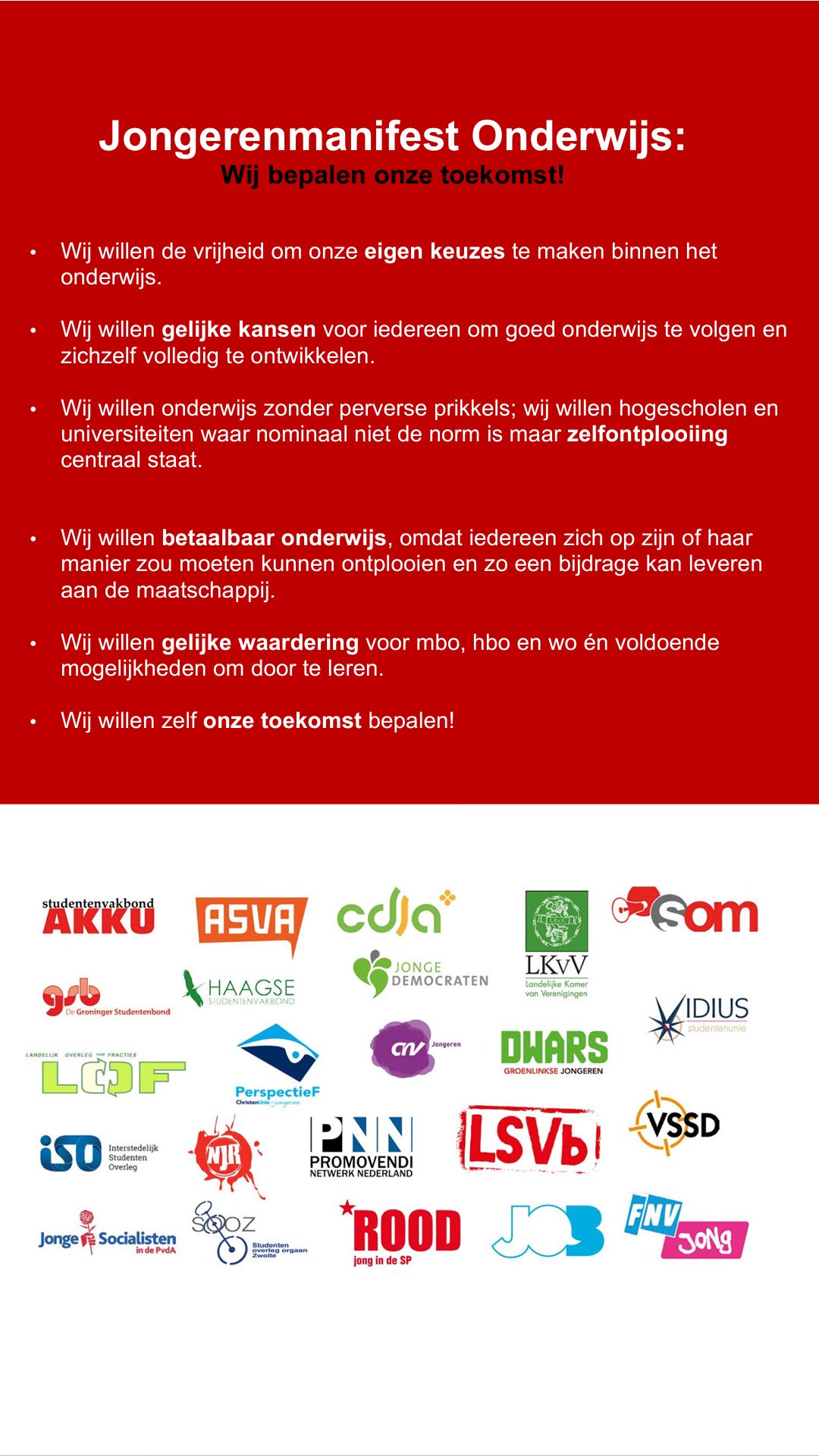 woensdag 05 oktober 2016 18:41 Op woensdag 5 oktober heeft PerspectieF, ChristenUnie-jongeren zich gevoegd in een brede coalitie van tientallen jongerenorganisaties om zich uit te spreken over een toekomstbestendig onderwijsbeleid. Deze onderwijscoalitie kwam samen in De Balie in Amsterdam en presenteerde het manifest ‘Onze toekomst’. Voorzitter Jarin van der Zande: “Met de verkiezingscampagne in het vooruitzicht is het van groot belang dat jongeren zich verenigen en nu al concrete voorstellen doen voor toekomstig onderwijsbeleid.