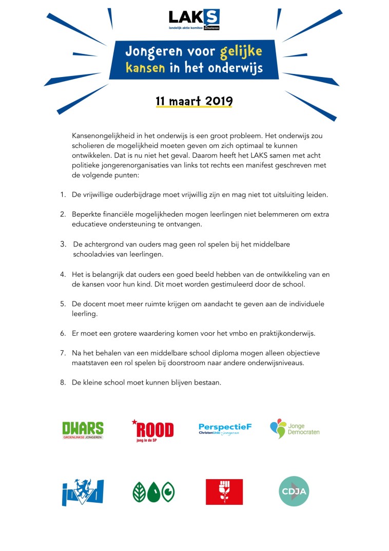 maandag 11 maart 2019 14:13 Kansenongelijkheid in het onderwijs is een groot probleem. Het onderwijs zou elke scholier de mogelijkheid moeten geven om zich optimaal te kunnen ontwikkelen. Dat is nu niet het geval. Daarom heeft PerspectieF, na initiatief van het LAKS, samen met zeven andere politieke jongerenorganisaties een manifest geschreven met punten om de kansengelijkheid in het onderwijs te verbeteren. Vanochtend werd het manifest in Nieuwspoort gepresenteerd.